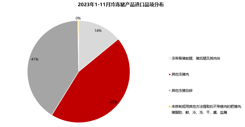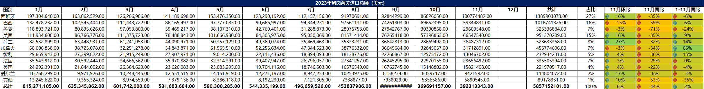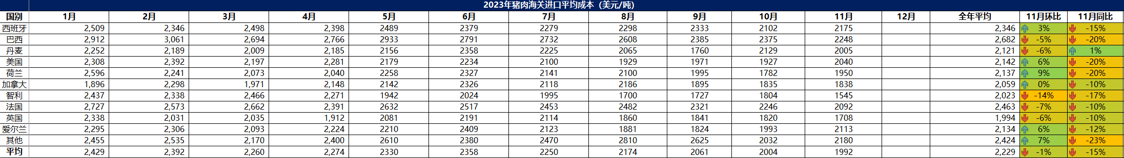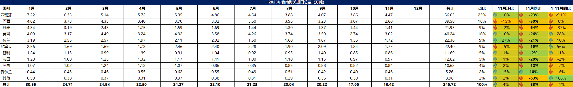 2023 年 11月中國主港豬肉進口量18.42萬噸,環比上升4%,同比減少33%。1-11月主港豬肉進口量246.72萬噸,同比下降1%。從進口國別看,其中,從西班牙進口豬肉共計56.03萬噸,同比減少 9.1%,占比 23%。從美國進口豬肉共計 40.24萬噸,同比增加28%,占比 9%。從巴西進口豬肉共計39.58萬噸,同比持平,占比16%。從丹麥進口豬肉共計 21.95萬噸,同比減少37%。從進口品項看,1-11月,凍帶骨豬前腿、豬后腿及其肉塊進口量 34.57萬噸,占比 14%。其他凍豬肉進口量110.42萬噸,占比 45%。其他凍豬雜碎101萬噸,占比 41%。豬油脂類進口量僅 0.68萬噸。從 進口金額看,1-11月,主港豬肉進口總額 58.57億美金,同比上漲 2%。其中,進口西班牙 豬肉金額 13.9億美金,同比下降6%。進口巴西豬肉金額10.16億美金,同比上漲 6%。進口美國豬肉金額 9.51億美金,同比上漲9%。進口丹麥豬肉金額 5.25億美金,同比減少24%。