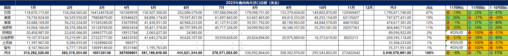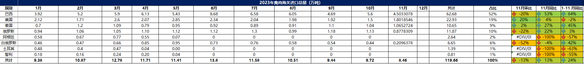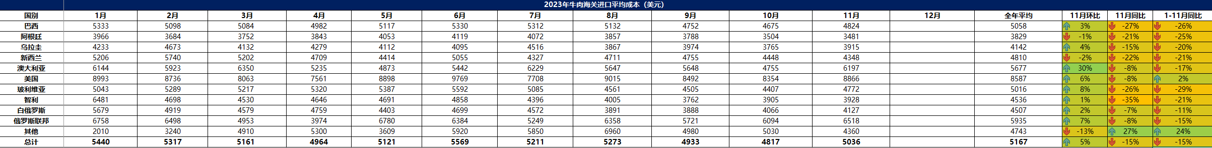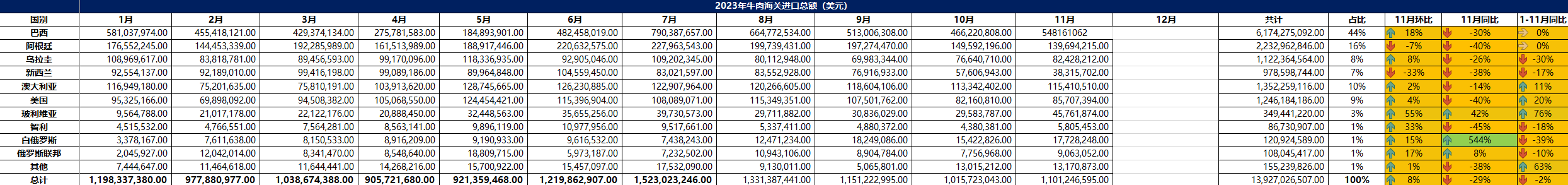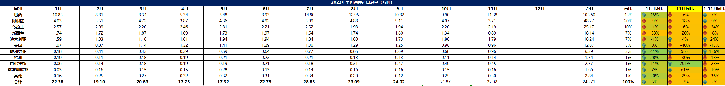 2023 年 11月中國主港牛肉進口量22.92萬噸,環比上升5%,同比減少 7%。1-11月, 中國主港牛肉進口總量 243.71萬噸,同比增加 2%。從進口國別看,進口巴西牛肉105.6萬 噸,同比下降6%,占比 43%。進口阿根廷牛肉48.27萬噸,同比增加 9%,占比 20%。進口烏拉圭牛肉25.17萬噸,同比減少6%,占比 10%。進口新西蘭牛肉 18.14萬噸,同比下降20%,占比 7%。進口澳大利亞牛肉 18.24萬噸,同比增加24%,占比 7%。從進口品 項看,凍去骨牛肉進口總量203.89萬噸,占比 84%。凍帶骨牛肉進口總量 39.81萬噸,占比 16%。從進口金額看,1-11月,中國主港牛肉進口金額共計 139.27億美金,同比減少 2%。其中,巴西牛肉進口金額 61.74億美金,同比持平。阿根廷牛肉進口金額22.33億美金, 同比持平。澳大利亞牛肉進口金額13.53億美金,同比增加11%。烏拉圭牛肉進口金額11.22 億美金,同比減少 30%。新西蘭牛肉進口金額9.79億美金,同比減少17%。