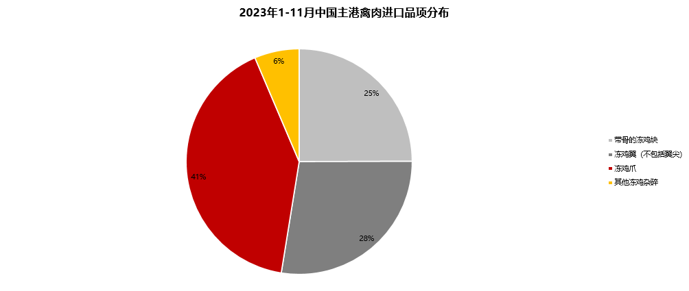 2023 年 11月中國主港禽肉進口量 8.46萬噸,環比下降13%,同比增加13%。1-11月,中國主港禽肉進口量119.66萬噸,同比增加 24%。從進口國別看,進口巴西禽肉共計 62.68萬 噸,同比增加 64%,占比52%。進口美國禽肉 22.93萬噸,同比減少 2%,占比 19%。進口俄羅斯禽肉 11.87萬噸,同比上漲3%,占比 10%。進口泰國禽肉10.65萬噸,同比增加45%,占比 9%。從進口品項看,帶骨凍雞塊進口量29.87萬噸,占比 25%。凍雞翼(不包括翼尖)33.01 萬噸,占比 28%。凍雞爪進口量49.14萬噸,占比 41%。其他凍雞雜碎進口量 7.66 萬噸,占比 6%。從進口金額看,1-11月,中國主港雞肉進口金額共計38.5億美金,同比增 加 11%。其中,巴西禽肉進口金額17.96億美金,同比增加47%。美國禽肉進口金額 7.48億美金,同比下滑 29%。泰國禽肉進口金額4.75億美元,同比增加 40%。俄羅斯禽肉進口金額 4.04億美金,同比增加20%。白俄羅斯禽肉進口金額 2.69 億美金,同比增49%。