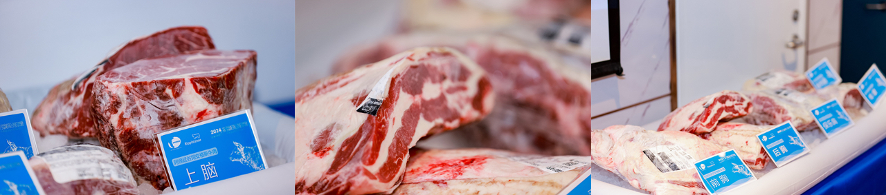 活動現(xiàn)場展示阿根廷谷飼牛肉部位,包括上腦、嫩肩、眼肉、西冷、板腱、眼肉蓋、保樂肩、后胸、前胸、牛霖等。
