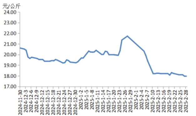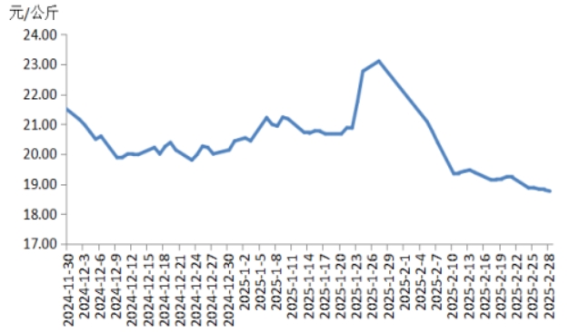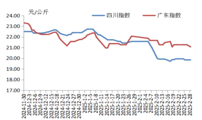 本周,廣東地區(qū)豬肉周均價為每公斤21.21元,環(huán)比下跌0.4%,同比上漲10.3%,較上周漲幅擴大1.7個百分點。周前期,豬肉市場供需較為平穩(wěn),價格以穩(wěn)為主;周后期,受周邊市場生豬價格行情偏弱影響,本地區(qū)散養(yǎng)戶出欄積極提升,疊加豬肉消費疲軟,經(jīng)銷商多壓價收購,帶動豬肉價格微跌。